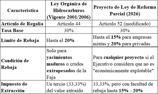La propuesta de reforma de 2026, impulsada en un contexto de transición política y presiones internacionales, introduce modificaciones que alteran la rigidez del sistema de regalías establecido en las leyes de 2001 y 2006. El Artículo 52 del proyecto de ley es el punto de mayor controversia, al permitir que el Ejecutivo Nacional rebaje la tasa de regalía basándose en criterios de «economicidad».